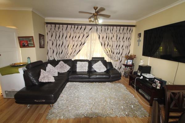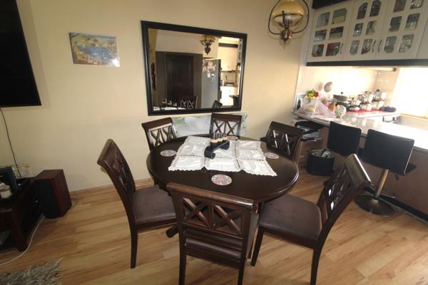Downstairs, the home showcases a dazzling granite kitchen with built-in conveniences, flowing seamlessly into the open-plan lounge and dining area, enhanced by warm laminated flooring. An enclosed awning provides a cozy, all-season entertainment space that opens onto a beautifully maintained communal garden, offering a peaceful retreat for relaxation or hosting guests.