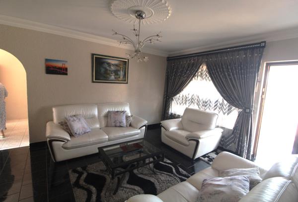 This modern stunning 3 bedroom home with built-in in cupboards. 2 bathrooms, 2 lounges and dining room. Stunning fitted kitchen. Beautiful laid out tiles. Double lock up garage and carport. Massive swimming pool for parties and entertainment. Electronic access. Safe and secured with alarm and beams.