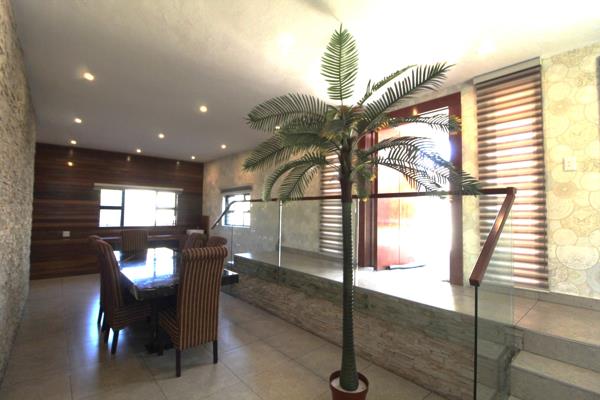 This architecturally designed home set on almost level land offers you a combination of style, everything under one roof, entertainers dream, both interior and exterior. The large meranti door opens onto the entrance to the open plan dining room, lounge x2, fitted caesarstone kitchen with island, hob and microwave customized, elo and scullery with top of the range cupboards. Feature walls, making a statement with designer downlighting to enhance the beauty of the home. Dining room is fitted with a large marble table, glass balustrades enhance a chic classic style.