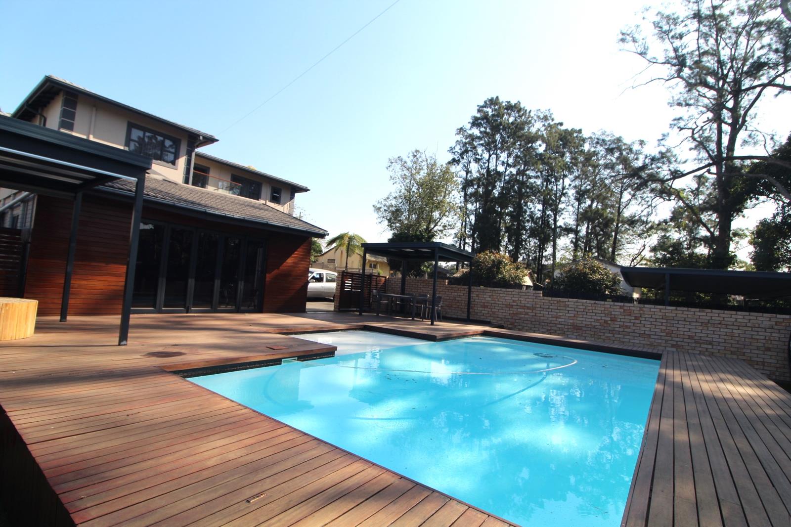 Outdoors has a heated pool surrounded with a wooden deck, plus open lapa with private bath and shower fenced by reid, a feel of being with nature with open air shower. The entertainment area has plenty of space with an added double garage, and access for multiple parking. The property is gated, paved and tarred.