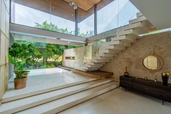 The main house, of grand proportions offers exceptional, top quality finishes, with no expenses spared. The grand, double volume entrance with sweeping staircase leads to several, open plan reception rooms of grand proportion and bespoke open plan kitchen all leading seamlessly to external living areas with expansive undercover patio with firepit and jacuzzi overlooking the spectacular, feature pool and level, landscaped indigenous garden.