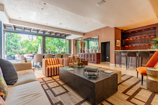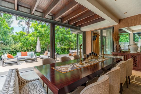 The open plan layout with floor to ceiling glass sliding doors, allowing natural light to transcend from indoor to outdoor living space with its tranquil water feature, pool and natural surroundings.
