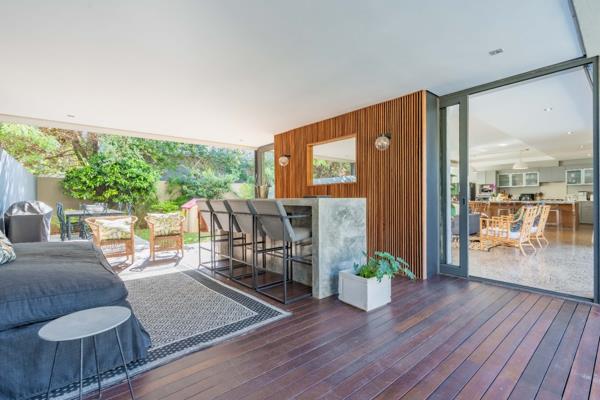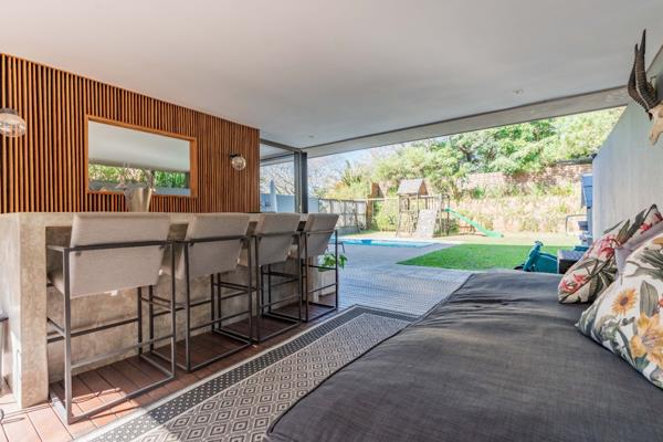 At the heart, the fully fitted kitchen delivers clean lines and serious capability, with sleek cabinetry, a generous island that doubles as a breakfast bar and conversation counter, and premium appliances including an eye-level oven, a second oven, and a gas hob. A separate scullery ensures practicality is seamlessly catered for, keeping the main space pristine, while a stylish guest loo completes this level of entertaining ease. Extending directly from here, the living areas dissolve onto an expansive covered terrace. The outdoor conversation counter anchors relaxed entertaining beside the sparkling pool, while timber accents, built-in seating, and landscaped surrounds complete a garden designed for both grand gatherings and quiet afternoons.