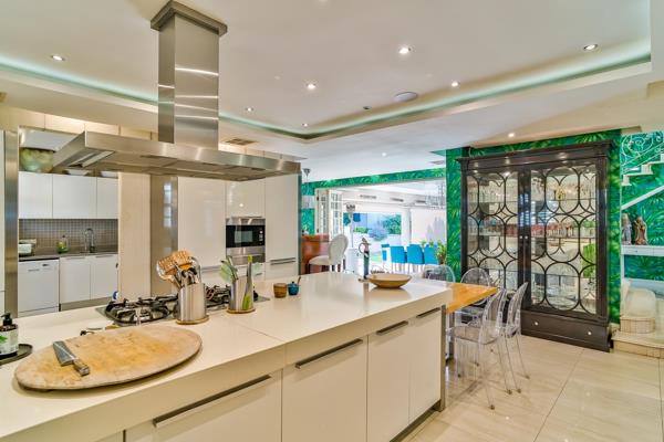 There is a solid mahogany bar with all the fittings such as a Scottsman ice maker and a SMEG wine cooler. The imported kitchen, which is state of the art with an electric under counter oven as well as an eye level oven and with Caesarstone counter tops and American shutters. The kitchen also has added features such as a scullery and laundry with a double sink, an extractor fan and waste disposal unit. The kitchen sports a breakfast bar, prep bowl and is decorated with a combination of stainless steel and Caesar stone. There are imported pull out drawers for cutlery and spices etc. The kitchen is kept cool by air conditioners and there is also a gas hob on offer. The fridge is hidden behind designer cupboards and the kitchen also contains 3 fridges and freezers and AEG appliances.