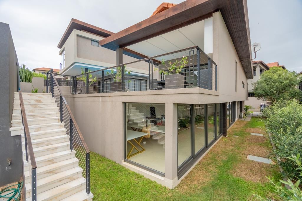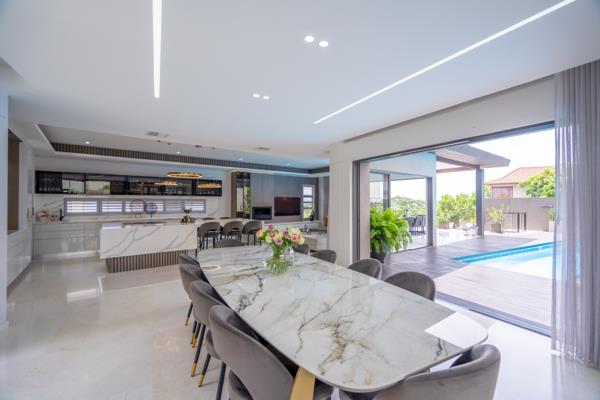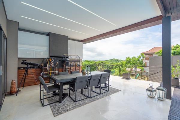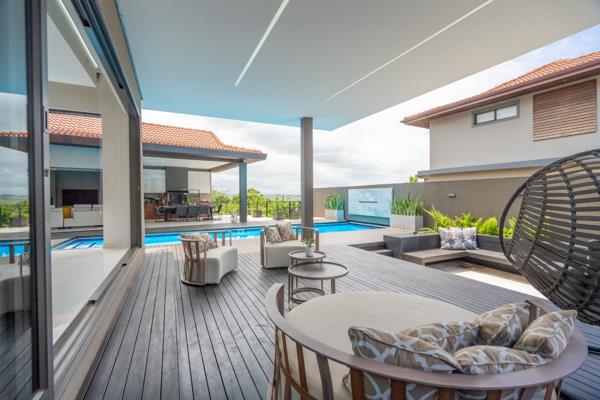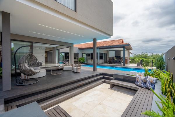 The entrance creates a welcoming atmosphere and is the epitome of luxury through the use of the wood , stone , glass and presents a water feature and koi pond. The floor plan includes a private lounge ,dining room and TV lounge all opening up with stack doors to a U- shaped courtyard that houses the heated pool and sundeck with stunning inland views , covered patio with built in braai and a sunken lounge with firepit creating a sense of privacy without isolating the space from the surroundings.