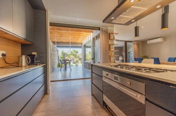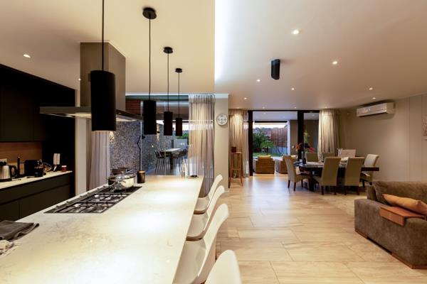 Step into this exquisite modern residence, where an expansive open-plan layout seamlessly integrates the living, dining, and kitchen areas. The contemporary kitchen is a chef''s delight, featuring a large island with bar seating, a gas hob, sleek dark cabinetry, and ample space for culinary creativity. Recessed lighting and stylish pendant fixtures illuminate the space, while integrated air conditioning ensures year-round comfort. Large glass doors effortlessly connect the interior to the outdoor entertainment areas, fostering an exceptional indoor-outdoor flow.