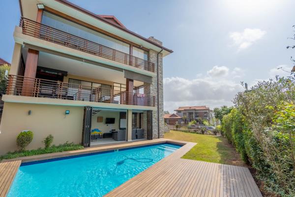 The layout epitomizes style and luxury and offers a formal lounge, open plan dining room, chef style kitchen with breakfast nook, scullery and fitted AEG appliances, a cinema room, 3 en-suite bedrooms, private gym, enclosed entertainers patio with automated weather blinds and fitted bar, a braai room with stack doors that open up onto a sparkling pool surrounded by decking and a landscaped garden.