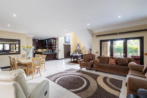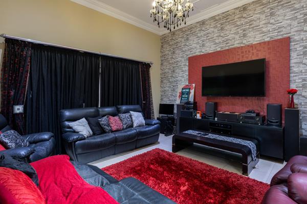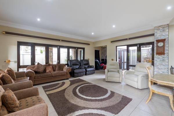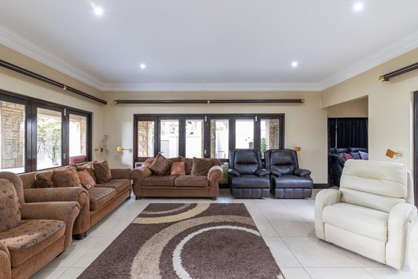 This executive residence in the prestigious, secure enclave of Izinga combines luxury with modern functionality. A grand entrance flows seamlessly into spacious living areas, with two lounges that cater to diverse lifestylesone transformed into a dedicated cinema room, while the other opens onto an elegant undercover patio through sleek aluminium folding stack doors, ideal for indoor-outdoor entertaining.