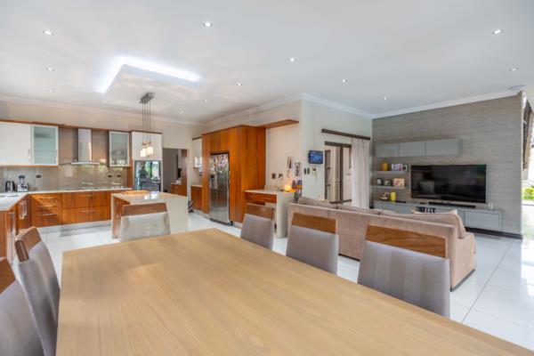 This residence boasts a seamless, modern open floor plan that effortlessly blends functionality and style. The formal lounge, TV lounge, and dining room create an ideal space for entertaining and family gatherings. The gourmet kitchen is a chefs dream, featuring a central island, a breakfast nook, a five-plate electric hob, and top-of-the-line appliances. A separate scullery with a gas hob provides added convenience for daily living.