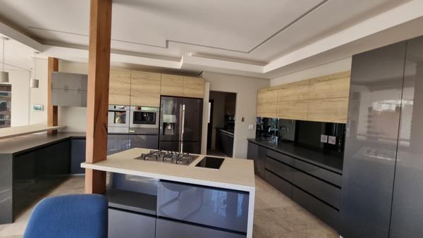 The open-plan living area, has a state-of-the-art designer kitchen, opening onto the wrap-around balcony of 100m square meters which is fitted with outdoor weather blinds.