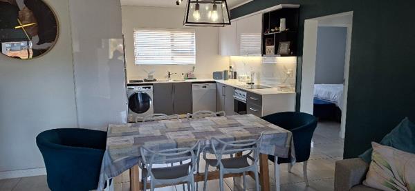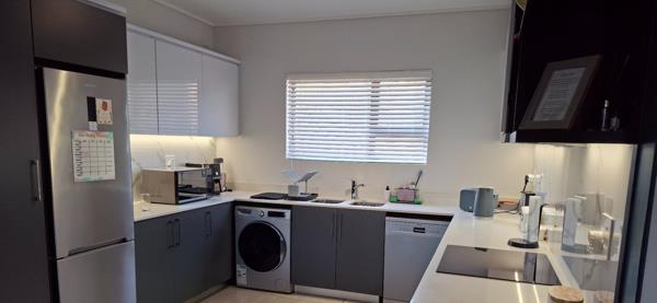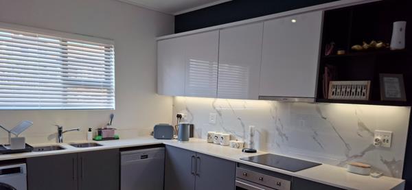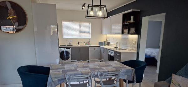 The Caesar-stone kitchen is fully fitted with Smeg appliances and include and electric hob, extractor fan, fridge/freezer, dishwasher and washing machine/drier combo. A seamless flow from the kitchen to the dining room and lounge, leading onto a covered patio with a built-in-braai allows for perfect entertainment.