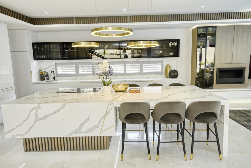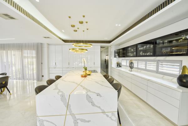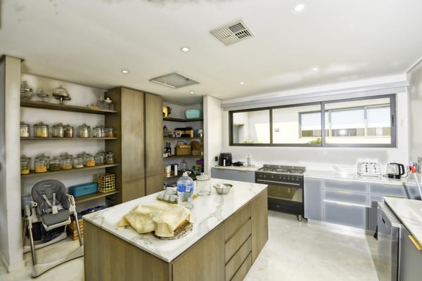 A state-of-the-art chef''s kitchen with premium appliances and extensive scullery that is stylish, and it has unique designer lights.