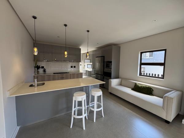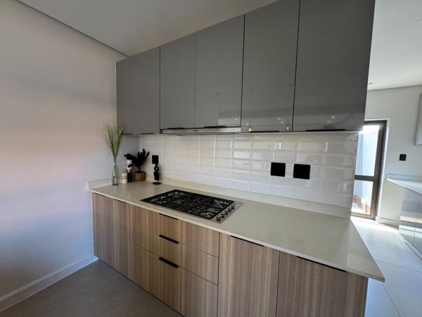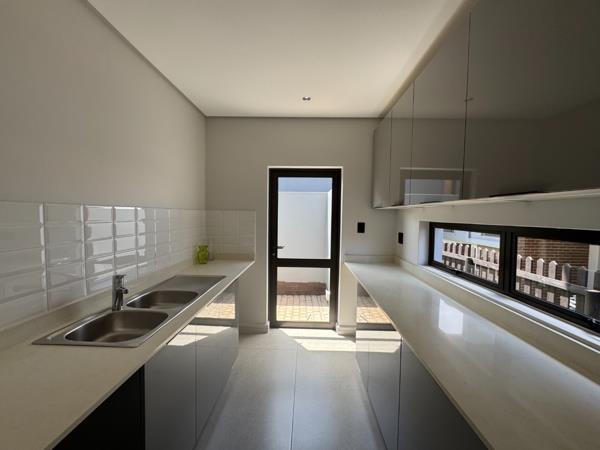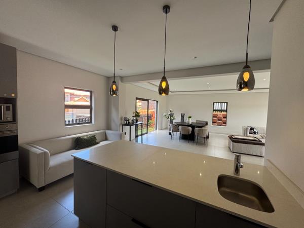 This brand-new double-storey townhouse offers a blend of luxury, comfort and practical family living. The home features a contemporary designer kitchen with a separate scullery, flowing effortlessly into the open-plan living and dining areas. Large doors lead out to a covered patio and private garden, creating a seamless indooroutdoor lifestyle perfect for entertaining or relaxing.