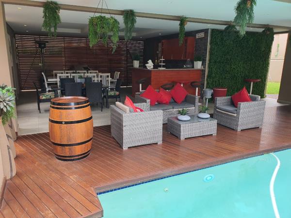 Outdoor living is paramount in this dream home. An expansive terrace, perfect for alfresco dining or lounging, connects to the pool with a dramatic view of the landscape. A private outdoor kitchenette, braai/bar and multiple seating areas create an ideal space for entertaining. Beyond the terrace lies a large, manicured lawn, perfect for family activities, while walking paths wind through gardens that boast rare plants and flowers. Additionally, the home features a staff quarters, ensuring complete privacy and comfort.