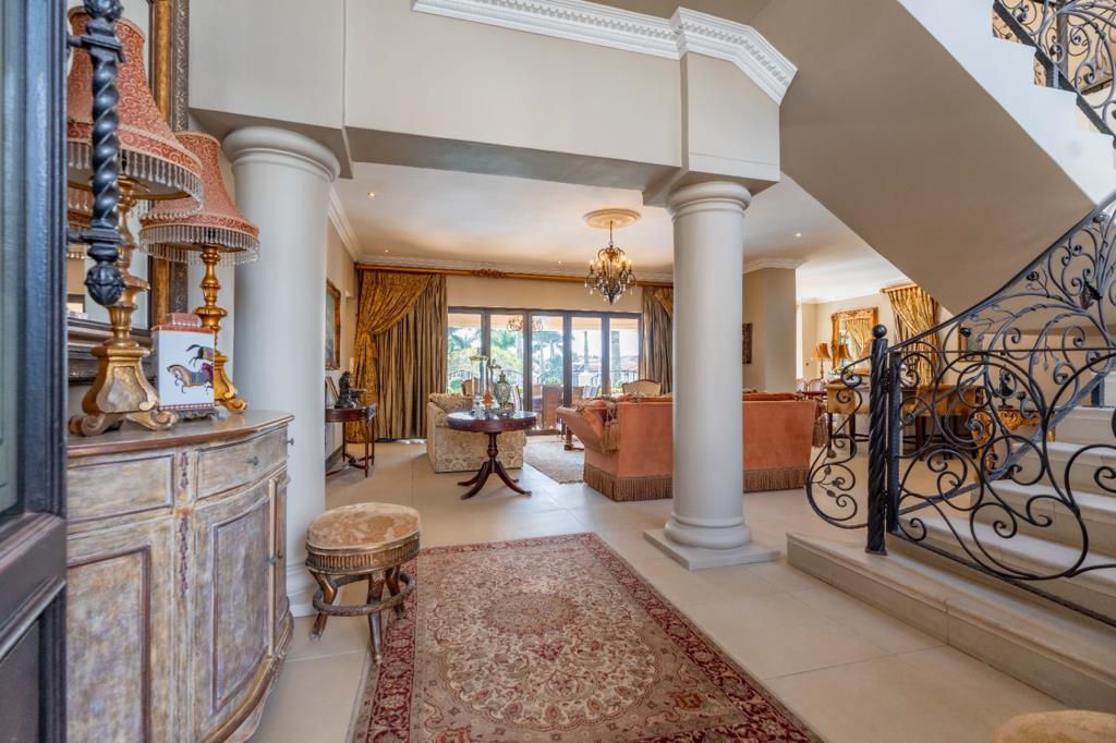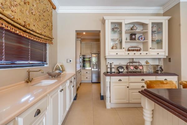 Step through the grand entrance into an expansive open plan living area where a light filled lounge and dining room seamlessly flows towards a gourmet kitchen beautifully finished with high-end fittings and a separate scullery, the heart of the home. Beyond lies a sparkling pool, framed by a manicured garden. A dedicated TV room offers a cozy escape for relaxed family time.