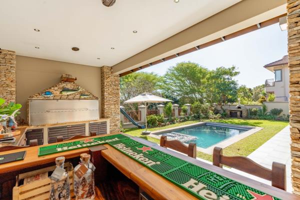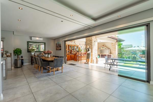 The impressive Koi pond with a water feature and double volume entrance welcomes you to a seamless loungedining room that effortlessly opens with glass stacker doors onto an expansive patio with a built in braai, a heated pool, a jacuzzi, and pizza oven. Surrounded by a manicured landscaped garden. An entertainers dream.