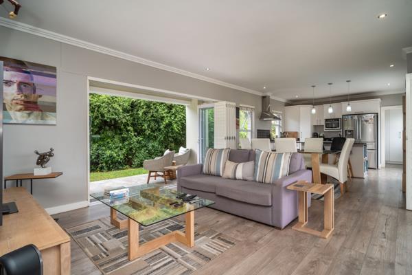 The home is in excellent condition, featuring three spacious front-facing en-suite bedrooms with captivating views, plus a guest toilet. The bright open-plan living area flows from the lounge and dining space into a modern kitchen with quartz countertops, a centre island, a gas hob, an AEG oven, and a separate scullery. A second lounge and built-in oak bar open onto an additional patio, creating an ideal space for relaxed living and entertaining. Quality finishes include laminate flooring, American shutters, fitted blinds, full air-conditioning, fibre readiness, a 3KVA inverter system, and a plumbed 720-litre JoJo tank.