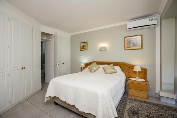 The property includes three well-presented bedrooms, a modern family bathroom, and a master bedroom with ample cupboard space and a modern ensuite. Sliding doors in the master bedroom and second bedroom open onto the airy patio. Additional features include air conditioning, fiber internet, and an inverter.