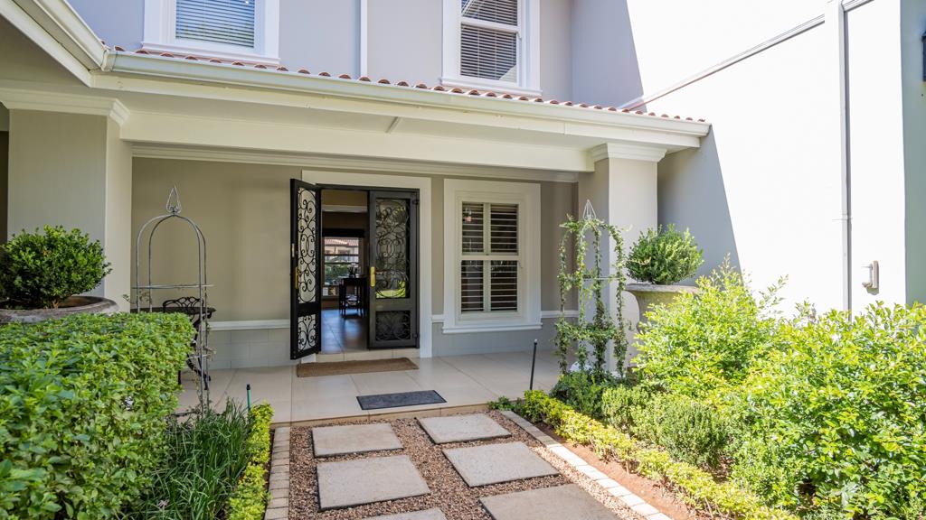 This exceptional residence boasts an abundance of features that make it a true gem. Upon arrival, youre greeted by a beautifully manicured garden that sets the tone for the homes grandeur. The double-story design exudes an impressive presence, with a grand entrance hall that flows seamlessly into an expansive open-plan lounge and dining area, leading to a generous covered patio. The patio is equipped with folding security shutter doors, offering both protection and ease of access to a built-in braai and a sparkling swimming poolmaking it the ultimate entertainer''s paradise.