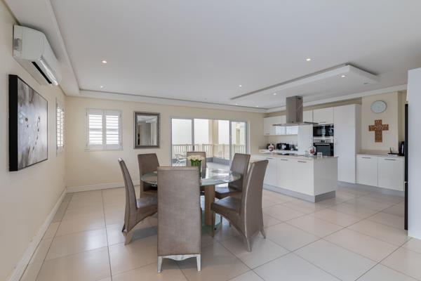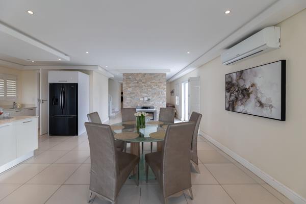 The modern kitchen is equipped with Caesar stone countertops and high-end Bosch appliances, with a separate scullery that is fully plumbed for both a washing machine and tumble dryer. The kitchen seamlessly flows into the dining and lounge areas, where a striking feature wall with a firepit divides the two spaces. The dining room opens onto a balcony, providing breathtaking views of the ocean and La Lucia. Floor-to-ceiling glass stack doors create a seamless transition from the living and dining areas to a balcony and well-maintained garden, perfect for effortless indoor-outdoor living.