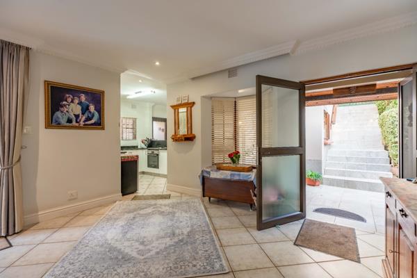 Stairs from the double garage lead down to the paved pretty garden and double door entrance fitted with special locking screen doors. The open plan reception and living area is filled with natural light, sliding doors open from the dining room to the sunny entertainment area, bar and pool and also from the lounge to the deck and garden.