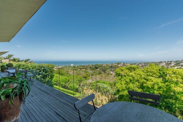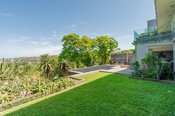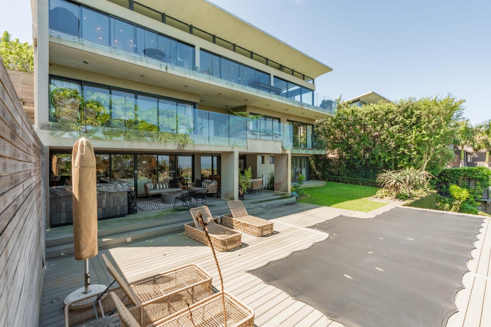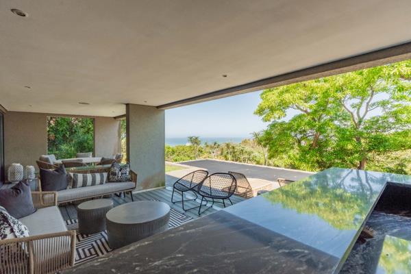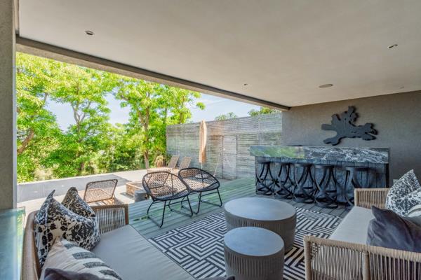 The upper level forms the heart of the home, where expansive open-plan living areas are framed by floor-to-ceiling glass that captures the uninterrupted seascape. A fitted conversation counter anchors the flow between the lounge and dining spaces, while the sleek, designer kitchen features elegant cabinetry, a fitted coffee station, and modern counters complemented by a separate scullery and laundry. Ducted air-conditioning, piped speakers, and soft ambient lighting enhance the comfort and mood, while glass doors extend the living spaces onto an external, private entertainment terrace an architectural statement defined by wooden slatted walls, fluted accents, and a skylit roof that bathes the area in natural light. The built-in braai, organic textures, and layered greenery create a conservatory-style setting tranquil, sophisticated, and perfect for year-round entertaining against the backdrop of the ocean views beyond.