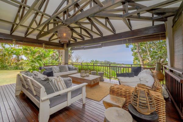Enter down half a level, to be greeted by fabulous, seamlessly flowing living areas with lounge, dining, fitted bar to covered deck boasting spectacular sea views over the luscious valley. Enjoy balmy Durban afternoons in the comfort of your own home, complemented with a jacuzzi and second private outside braai area. Guests can enter directly from the multi- car parking in front of the house. (Extra visitors parking is available in nearby cul-de-sac at complex gate)