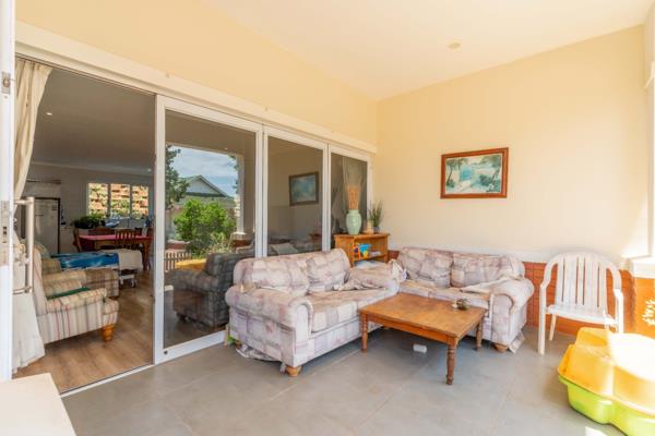 The home features an open-plan design with a spacious lounge and dining area that flows effortlessly through stack-back aluminum doors onto a covered patio. The patio overlooks a private, level, and fully fenced garden, creating a peaceful outdoor space perfect for relaxation or light gardening.