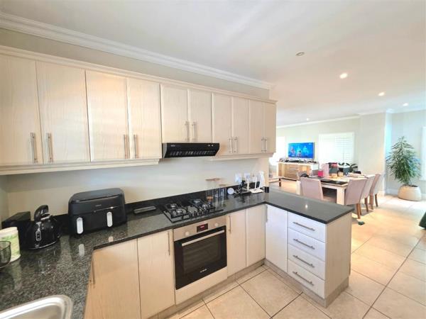 The townhouse features four spacious bedrooms and three bathrooms, making it ideal for both family living and entertaining guests. The open-plan design is complemented by a well-equipped kitchen that flows effortlessly into the lounge and dining room, providing a warm and inviting atmosphere. Large windows allow natural light to flood the space, enhancing the contemporary decor throughout.