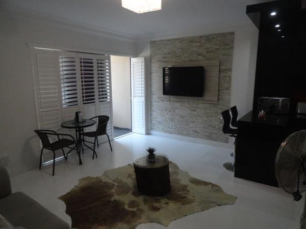 Perfect Lock Up and Go Modern Apartment For Sale. Immaculate apartment For Sale. Modern kitchen with state of the art finishes, loads of cupboard and counter space, has a breakfast nook and gas stove. Open plan living area with screed flooring and beautiful white shutters, leading out to a lovely sized balcony. 1 Spacious bedroom with a full bathroom shower and bath.