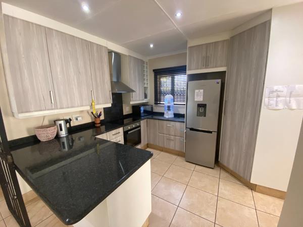 Three generously sized bedrooms feature built-in cupboards, with the main bedroom offering an en-suite bathroom and sliding doors that lead to the glistening pool. The second and third bedroom share a bathroom, also with modern finishes, and comes equipped with a shower, basin and loo. All bedrooms have air conditioners as well as the lounge.