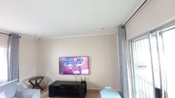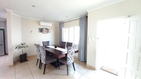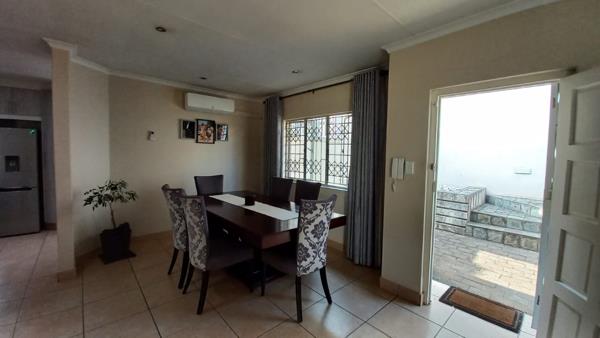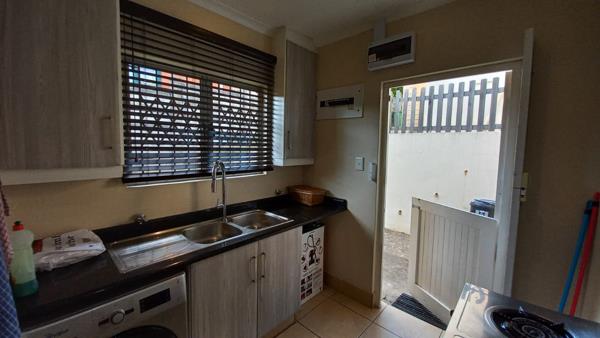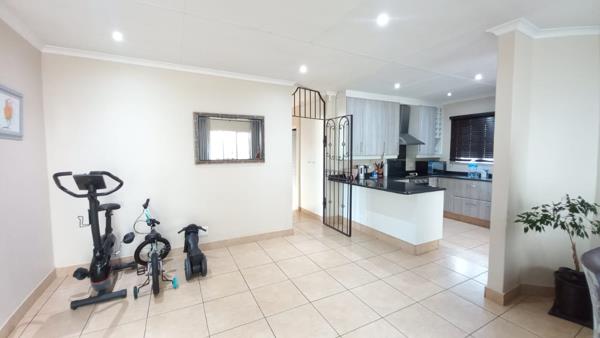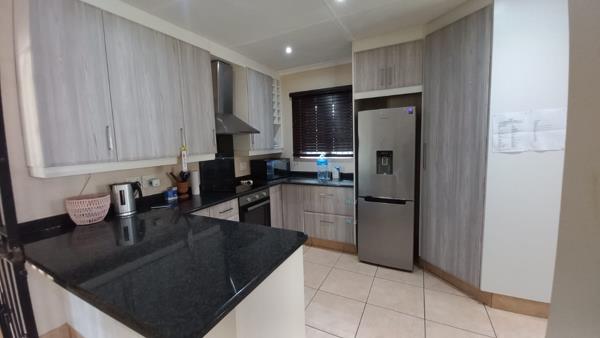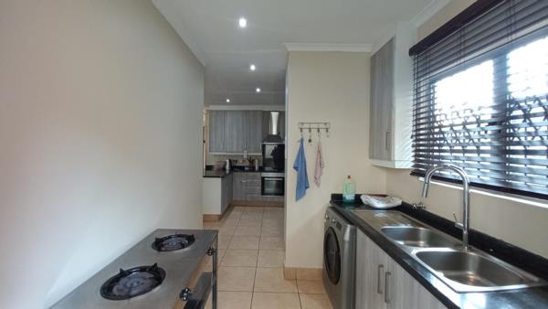 Step down a few stairs to enter a beautifully presented, fully tiled open-plan living space, featuring a spacious lounge, dining area, and a modern kitchen. The kitchen is a true highlight, offering ample built-in cupboards, granite countertops, and both electric and gas hobsperfect for uninterrupted cooking during load shedding. A separate scullery provides additional convenience with plumbing for a washing machine and dishwasher.