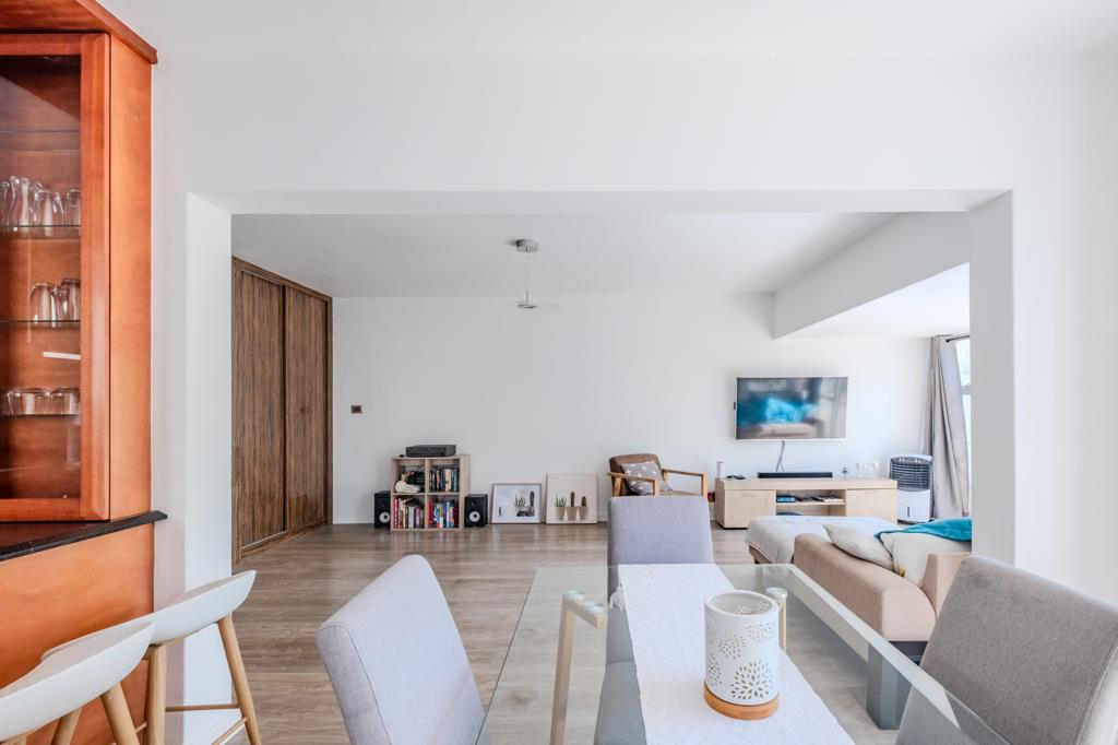 This light-filled duplex offers spacious open-plan living, flowing seamlessly onto an exceptionally large tiled patio with gorgeous views over Sunningdale Park and the leafy surrounds. The generously sized kitchen is fitted with granite countertops, ample cupboard space, and a separate scullery. It includes an electric hob with extractor, a double eye-level oven, and plumbing for both a washing machine and dishwasher.