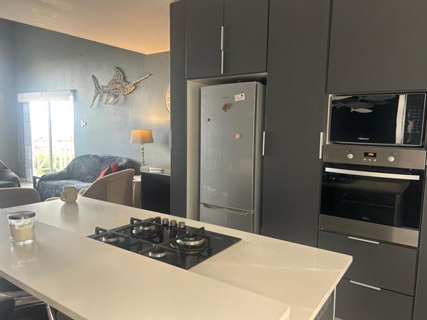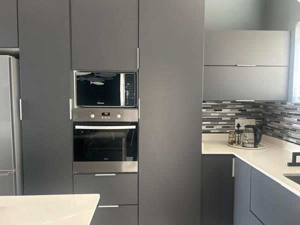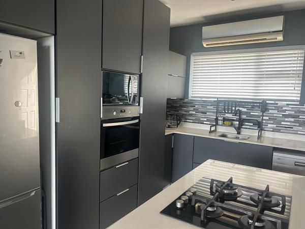 The whole unit is tastefully decorated in soft grey hues and big modern tiles. The kitchen has Caesarstone counters, sleek cabinetry and is modern and classy. There is a fancy high end pantry cupboard, eye level oven, gas stove and is plumbed for a dishwasher. The Caesarstone presents as a breakfast nook with stools. There is a big aircon which cools the bottom level of the duplex.