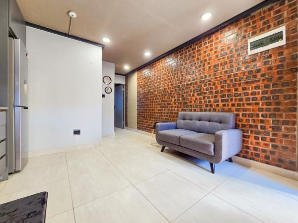 Step into a spacious open-plan kitchen, lounge, and dining area designed for modern living. The kitchen is fitted with built-in cupboards, an oven, hob, extractor, and plumbing for a washing machine. A stylish brick feature wall adds character to the space.
