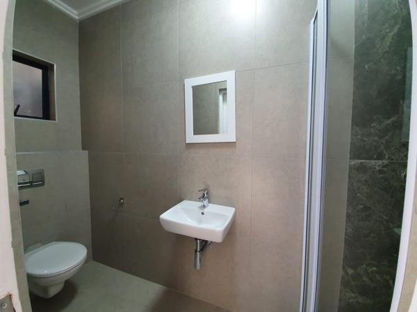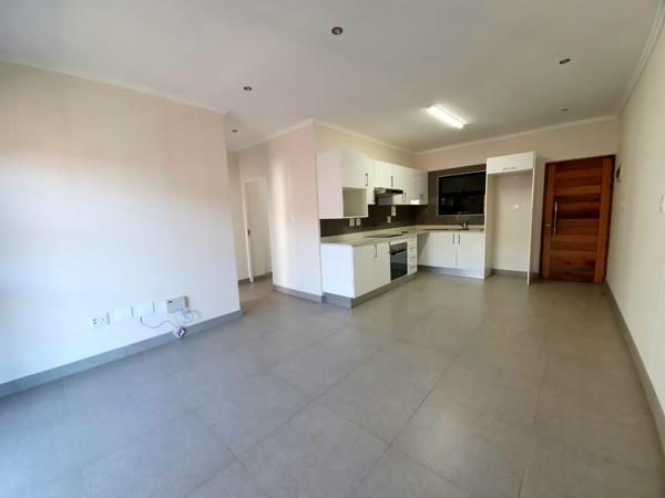 The kitchen is a lovely open plan with Caesarstone top, double basin, and lots of cupboard space all soft closing mechanism. It has an electrical stove with plumbing done for a dishwasher or washing machine. There is space for a single door fridge and a microwave. It is fiber ready.