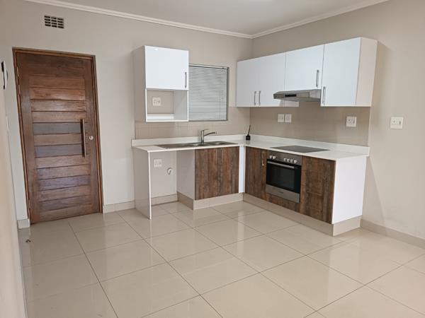 Modern kitchen with granite counter tops, porcelain tiles and downlighters.