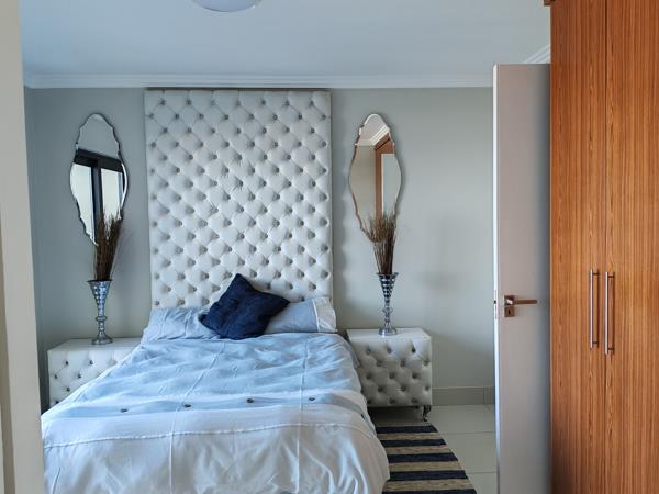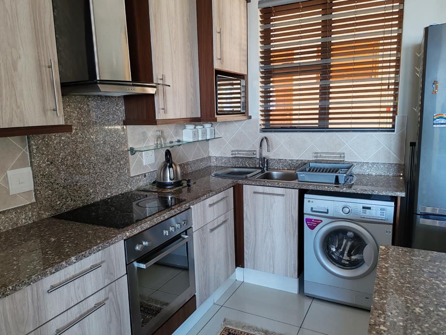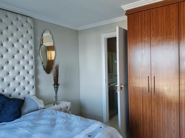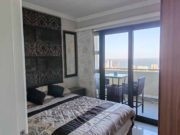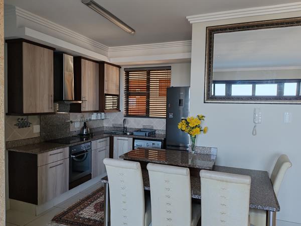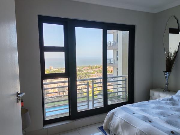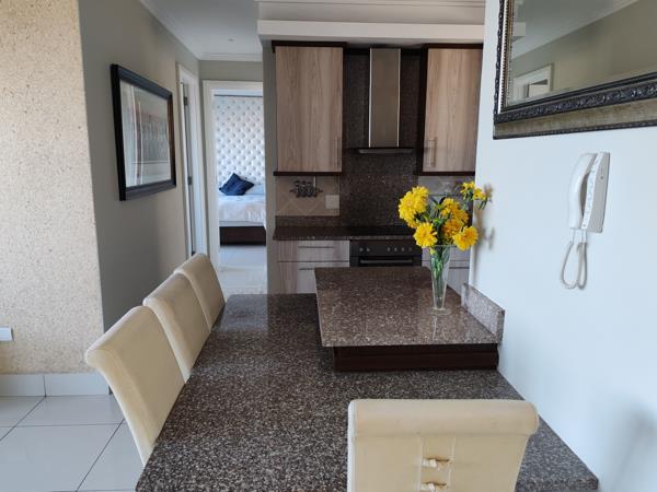The lounge/ dining room leads out to a balcony from which you can view Umhlanga Rocks and the ocean. Enjoy peaceful and secure evenings watching Umhlanga Rocks and its skyline lit up.