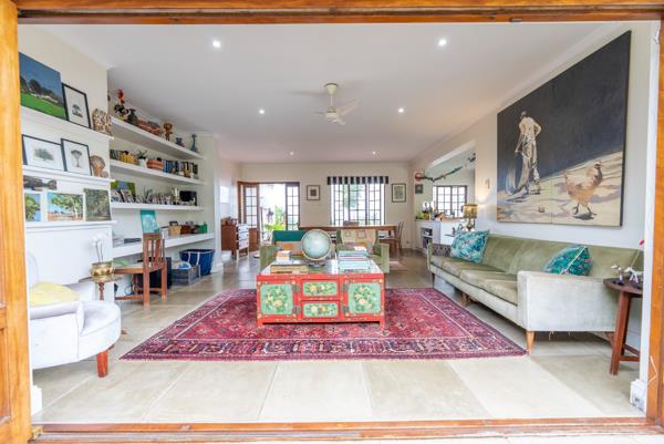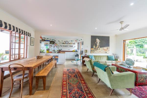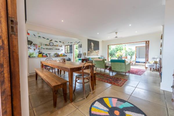 A magnificent unique property located in a quiet, secure area with only an eight minutes walk to the village, beach and all amenities. There are two dwellings both with separate entrances, perfect for an extended family or income generating. The main house (single storey) has been updated with stack-back doors and open plan living, offering four bedrooms, two bathrooms (MES) with solar geyser and a lovely one bedroom garden cottage with en suite. The garden and entertainment area is really beautiful with indigenous flora.