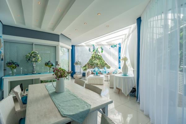 Generous living and dining areas flow seamlessly through to an expansive veranda that overlooks a sparkling pool and lush landscaped gardens. The outdoor entertainment area is a true highlight, featuring a tiki-style bar, kids jungle gym, and a covered Lapa with a full braai area the ultimate space for entertaining or relaxing in paradise.