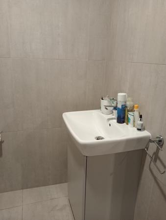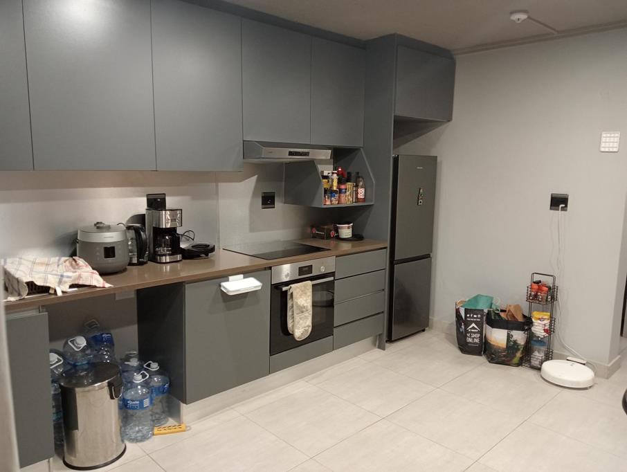 The apartment features a modern open-plan kitchen with built-in cupboards, seamlessly flowing into a comfortable lounge. The apartment offers a bedroom with a balcony.