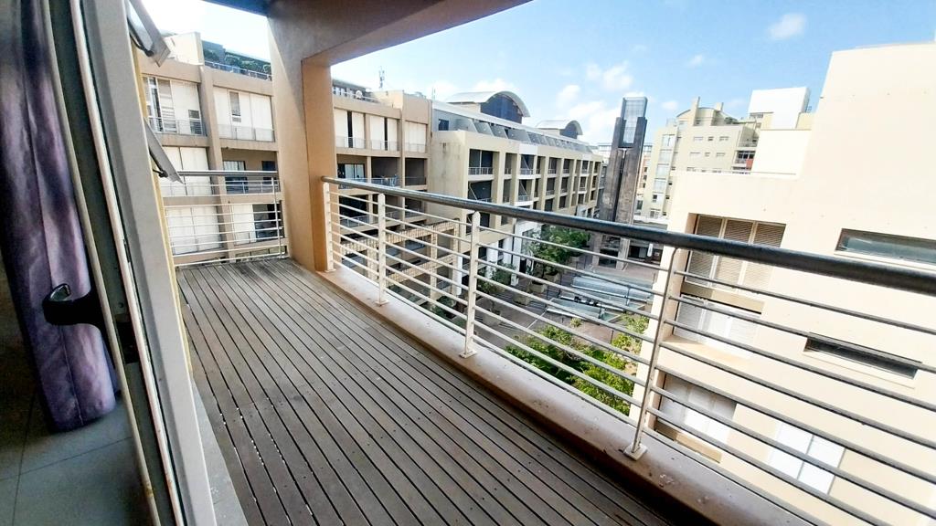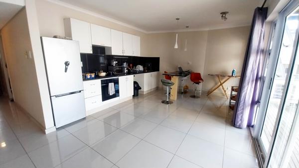 It features open-plan living and a spacious balcony accessible from the lounge, offering views of the outdoor restaurants and shops. The bedroom is generously sized with ample cupboard space and includes an en-suite bathroom with a tub and hand shower.
