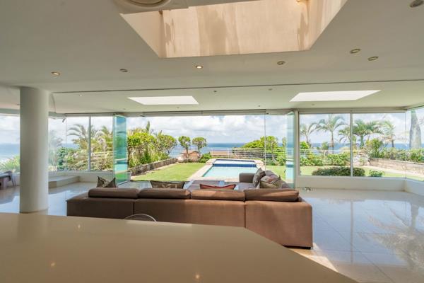 Frameless glass doors open out to the pool, manicured garden, and outstanding sea views, creating a seamless indoor-outdoor lifestyle Umhlanga is known for. A TV lounge off the main living area provides space for the whole family, while a downstairs bedroom and bathroom offer added convenience.