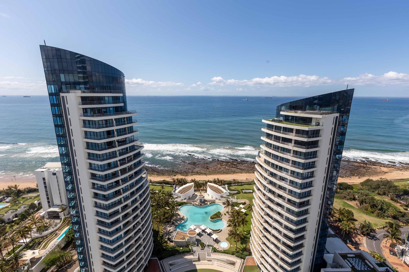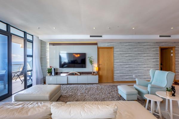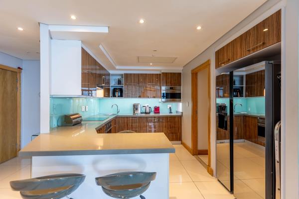 Ultra-modern apartment in The Pearls, Umhlanga with panoramic sea views. On entrance, this unit features an open plan living and dining area which opens out onto a covered balcony with 180-degree sea views. The kitchen features ample cupboard space and a separate scullery.