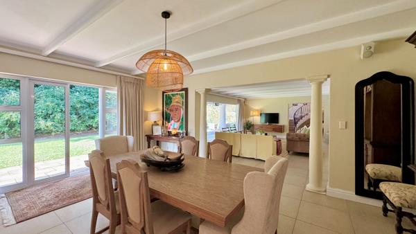 The open-plan lounge extends seamlessly to a covered patio and garden, perfect for relaxation or gatherings. A dining room and a stylish bar area, featuring natural wooden tops, add to the homes social appeal. The modern kitchen, equipped with a gas stove and a large scullery, is both functional and stylish.