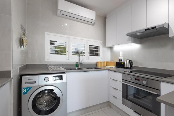 The granite kitchen is spacious with sleek carpentry and ample storage and counter space with a big air con which provides relief in the summer months. The end counter of the kitchen serves as a breakfast nook.