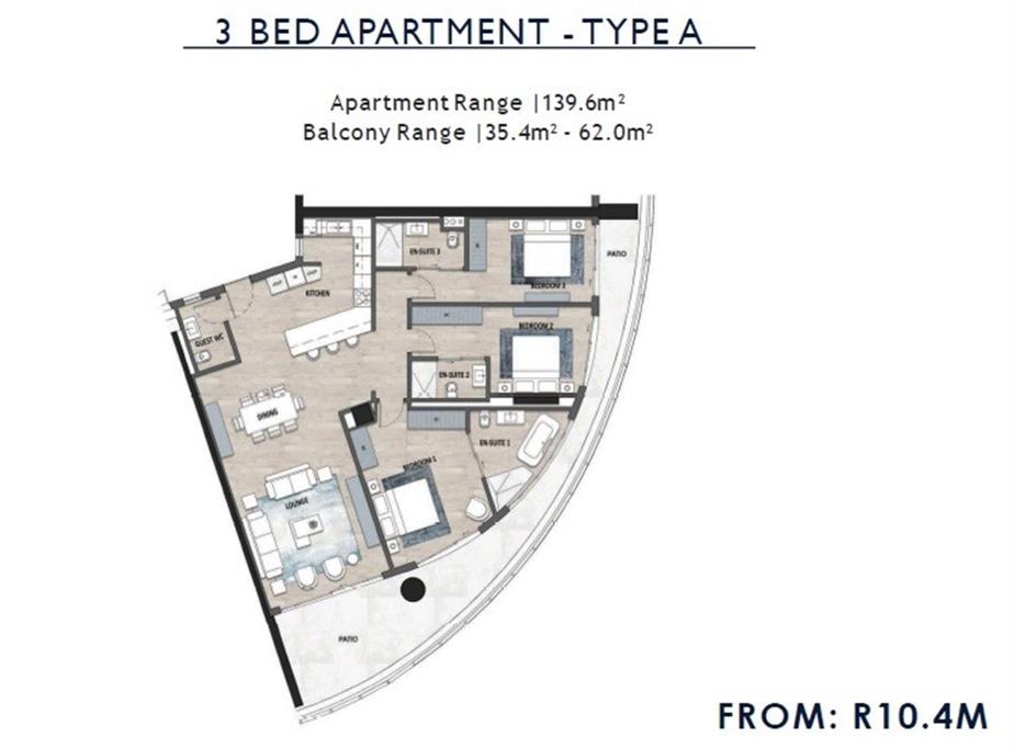 3 Bedroom apartments ranging from 175sqm - 188 sqm, This is made up of 139sqm interior plus wrap around balcony.