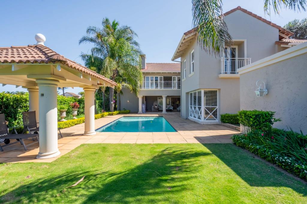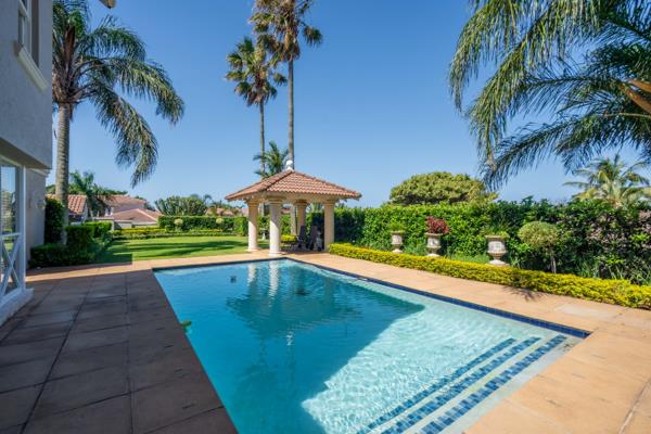 Welcome to luxury living at its finest in the prestigious neighborhood of Umhlanga. Prepare to be captivated by this magnificent, stunning, and fabulous upmarket mansion, meticulously crafted by a renowned architect. As you step through the grand entrance, you''re greeted by a sophisticated work-from-home office, ideal for those seeking both productivity and elegance. The dining room area beckons for family gatherings, seamlessly flowing onto two outdoor spaces. The front yard oasis boasts a glistening swimming pool, surrounded by meticulously landscaped gardens, creating the perfect retreat for relaxation and entertainment. The heart of this home lies in its open-plan design, where the lounge area seamlessly merges with a breakfast nook and a chef''s dream kitchen. Adorned with travertine countertops, built-in cupboards, a gas hob, microwave, oven, and a central island, this kitchen is a culinary haven for any discerning chef. Step through to the covered patio and outdoor dining area, extending your living space into the serene outdoors. A guest room on the lower level provides privacy and comfort, while upstairs, three generously proportioned bedrooms await. The master suite is a true masterpiece, evoking the essence of palace living. Featuring a dedicated makeup corner, a spacious walk-in closet, and a balcony with stack-up doors overlooking the lush outdoor surroundings, this sanctuary exudes opulence. The ensuite bathroom is a haven of luxury, boasting his and her basins, a rejuvenating shower, a lavish jacuzzi bath, and exquisite tile work. Travertine and laminate flooring throughout add to the home''s luxurious ambiance.