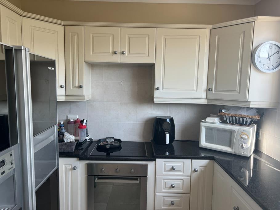 The functional kitchen is equipped with cream-colored shaker-style cabinetry, dark granite countertops, and a light tiled backsplash. It features integrated cooking appliances, including an oven and electric hob, alongside a modern Samsung refrigerator. A large window offers panoramic views, and an integrated washing machine adds convenience.