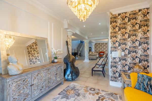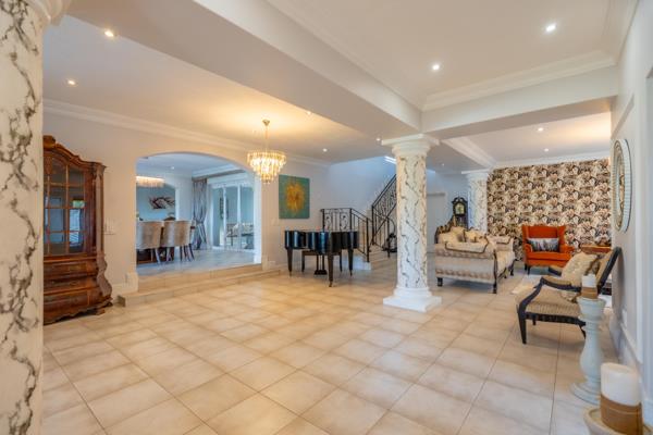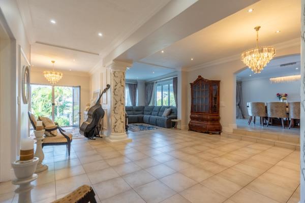 The entrance hall welcomes you into multiple living areas adorned with feature wallpaper and marble pillars. The expansive, open-plan dining and living areas are designed for seamless indoor-outdoor entertaining, leading effortlessly to the two, covered entertainment patios.